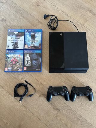 Se vende consola PlayStation 4 en color negro, junto con varios accesorios y juegos. - Incluye consola PS4. - Dos mandos DualShock 4. - Juegos: Killzone Shadow Fall, Star Wars Battlefront, Far Cry 4 Edición Limitada, The Last of Us Parte II. - Cable HDMI. - Cable de carga para mandos. Precio final, no regateo