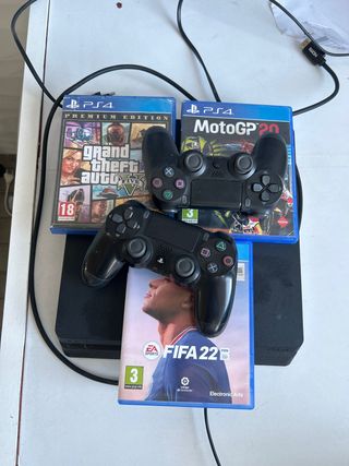 Consola PlayStation 4 con el mantenimiento hecho de hace un mes,junto con cuatro videojuegos y dos mandos. - Juegos incluidos: Grand Theft Auto V, MotoGP 20, FIFA 22 y FIFA 24 - Dos mandos DualShock 4 negros.