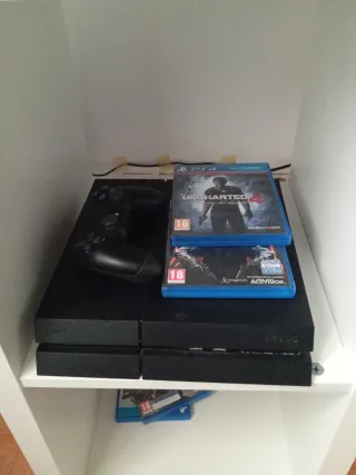 Consola PlayStation 4 modelo Fat con 500 GB de almacenamiento. - Capacidad de 500 GB. - Compatible con juegos en formato PKG. Se puede acompañar con los juegos que ves en las fotos del anuncio, si así lo deseas si necesitas mandos o disco duro para ampliar el almacenamiento externo, puedes preguntar sin compromiso .si quieres un juego en concreto pregunta,