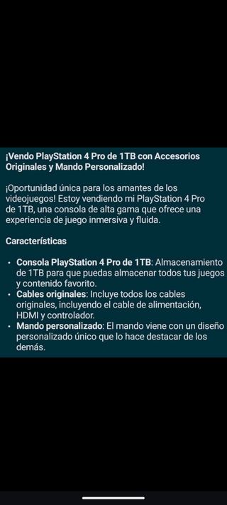 Consola PlayStation 4 Pro de 1TB con accesorios originales y mando personalizado. - Almacenamiento de 1TB para juegos y contenido. - Incluye todos los cables originales (alimentación, HDMI). - Mando con diseño personalizado único.