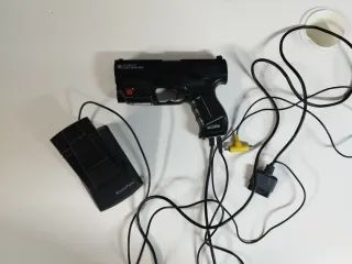 Pistola de luz The Real Arcade de Joytech, compatible con PlayStation y consolas Sega Saturn. - Incluye la pistola, la caja original, el pedal y el adaptador de corriente. - Incluye características como la función de retroceso (recoil) y un pedal para acciones como recargar munición. - Sólo para televisores de tubo (CRT), no compatible con televisores modernos planos. - En su caja original