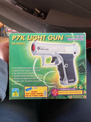 Pistola P7K Light Gun para PlayStation (PSX) con su caja original. - Compatible con modo PSX y Namco Guncon. - Compatible con software Konami y Namco G-CON45. - Función de vibración recoil. - Disparo y recarga automáticos. - Modo ametralladora (auto-fire y auto-reload). - Sensor de luz de precisión. - Seguro de empuñadura y función de recarga. - Cable de 6 pies. - Incluye adaptador G-CON45 para jugar a todos los juegos G-CON45.