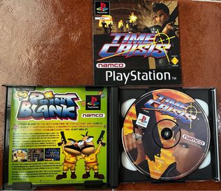 Juego de disparos Point Blank 3 para PlayStation 1. Tengo en venta el Time Crisis con la pistola G-Con 45 compatible, para hacer un pack. - Incluye carátula y manual en español. - Formato PAL. - Compatible con Memory Card y DualShock. La caja tiene un defecto (ver foto)