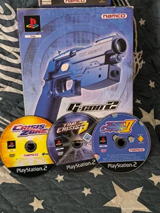 Pack de pistola G-con 2 para PlayStation 2 junto con varios juegos. - Incluye la pistola G-con 2. - Juegos incluidos: Crisis Zone, Time Crisis 2, Time Crisis 3, Virtua Cop: Elite Edition, Ninja Assault.