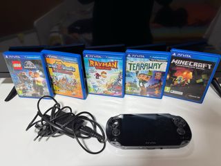 Consola portátil Sony PS Vita en color negro, junto con cinco videojuegos. Está en perfecto estado y totalmente funcional. Además, todo original y juegos en sus caratulas. - Juegos incluidos: LEGO Jurassic World, Invizimals: La Alianza, Rayman Origins, Tearaway y Minecraft: PlayStation Vita Edition. - Incluye cargador.