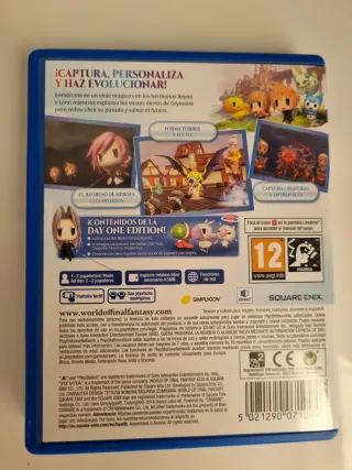 Edición Day One del juego World of Final Fantasy para PlayStation Vita. Incluye contenido adicional. - Juego World of Final Fantasy para PS Vita. - Edición Day One con extras. - Clasificación PEGI 12. - Requiere tarjeta de memoria para jugar.