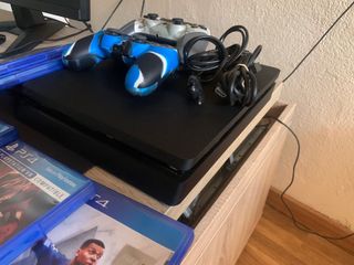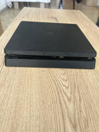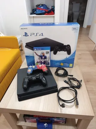 Consola PlayStation 4 Slim con disco duro de 500GB. - Modelo Slim. - Capacidad de 500GB. - Color negro. - Reseteada a valores de fábrica. Incluye todo el cableado para que la compres y juegues. Incluye los dos mandos de la imagen y el FIFA 23