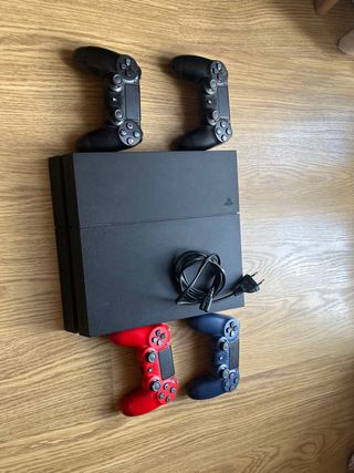 Consola Playstation 4 en color negro, con cuatro mandos. - Incluye consola. - Cuatro mandos de diferentes colores (dos negros, uno rojo y uno azul). - Cable de alimentación. - El boton de encendido no funciona. Se enciende con el mando. - uno de los mandos es para recambios. Se puede reparar