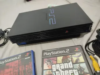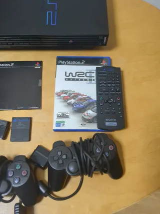 Consola PlayStation 2 en color negro, lista para disfrutar. No funciona el lector. - Incluye consola. - Mando original. - Mando adicional. - Tarjeta de memoria. - Mando a distancia. - Juego WRC: Extreme. - Cableado necesario.