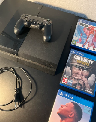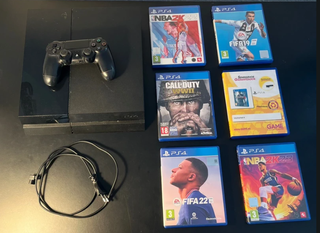 Play Station 4 + Dualshock 4 + los siguientes juegos: NBA 2k 22, NBA 2k 23, FIFA 19, FIFA 22, Call of Duty WWII y Uncharted 4. Viene también con el cable de alimentación.