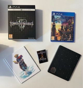 Edición Deluxe del videojuego Kingdom Hearts III para PlayStation 4. - Caja metálica con diseño temático. - Pin de Sora. - Libro de arte. - Juego Kingdom Hearts III.