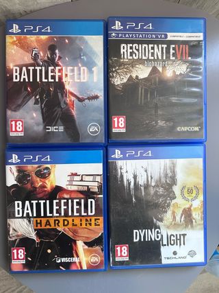 Lote de cuatro videojuegos para PlayStation 4. - Battlefield 1 5€ - Resident Evil 7 Biohazard 10€ - Battlefield Hardline 5€ - Dying Light 10€ Todos por 25€