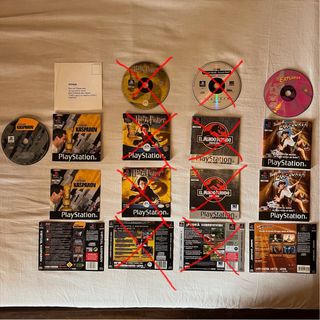 Se vende lote de videojuegos PlayStation 1 sin las cajas en buen estado. Completos a no ser que se indique. Incluye los siguientes juegos: - FIFA 2004 - 007 (doble pack) - Independence Day - Space Jam (portada con escrito a boli, imagen 5) - Virtual Kasparov - Barbie Explorer - La ruta hacia el Dorado (sin manual) - X2 (carátula recortada, contraportada doblada por la mitad, manual con inserciones a boli, imagen 6) - Rayman (sin manual, Platinum) - Manual Fifa 99 - Harry Potter. VENDIDO - Jurassic Park. VENDIDO No separo. Se vende todo el lote.