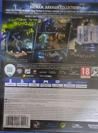 Colección definitiva de la trilogía de Batman Arkham para PS4. Incluye los juegos Batman: Arkham Asylum, Batman: Arkham City y Batman: Arkham Knight. Y idioma completo a castellano - Incluye contenidos del Season Pass. - Código promocional PSN para Batman: Arkham Knight Premium Edition.