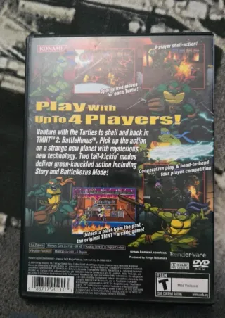 Teenage Mutant Ninja Turtles 2: Battle Nexus para PlayStation 2. El juego está en un estadc de conservación excelente, ideal para hostálgicos y coleccionistas. MPORTANTE: ESTA ES LA VERSIÓN NTSC. NO ES PAL, quiere decir que necesitas una consola americana para que funcione Estado: Disco, caja y manual en muy buen estado (ver fotos). Contenido: Incluye el manual original. Versión: Edición NTSC (Americana - ESRB) ideal para jugar a 60Hz o para coleccionismo internacional. Extras: Permite jugar hasta 4 jugadores y desbloquear el arcade original de las Tortugas Ninja.
