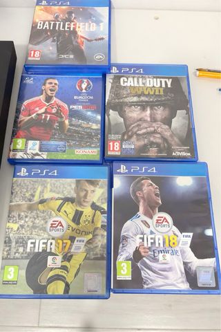 Consola PlayStation 4 en color negro, junto con varios videojuegos. - Incluye consola PS4. - Videojuegos: Battlefield 1, PES 2016, Call of Duty WWII, FIFA 17. - Cables de conexión.
