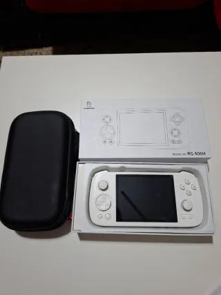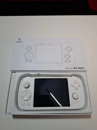 Consola portátil Anbernic RG406H en color blanco. Incluye funda protectora. Completamente configurada para que solo sea encender y jugar, más de 25 sistemas con sus mejores juegos la gran mayoría en español(sistemas clasicos de todas las generaciones desde atari hasta ps2, wii, gameboy, NeoGeo,NES), más de 300gb de juegos. -MicroSD de 256gb de alta velocidad - Funda - Diseño ergonómico. - Pantalla nítida. - Controles precisos. Solo se ha usado para configurarla, la estrenas tú, mas información escribe