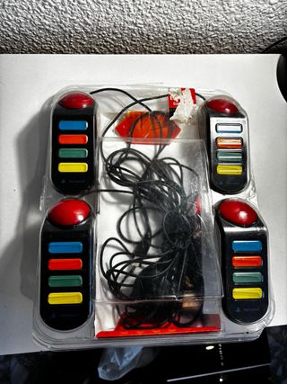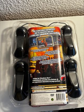 Pack de cuatro mandos Buzz para PlayStation 2. Ideales para jugar en familia o con amigos. - Incluye 4 mandos Buzz. - Diseñados para PlayStation 2. - Cada mando tiene un botón rojo grande y cuatro botones de colores (azul, naranja, verde, amarillo).