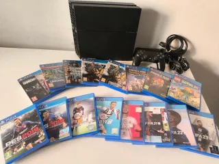 Consola PlayStation 4 en color negro, lista para disfrutar. Incluye un mando y varios videojuegos. - Mando DualShock 4. - Juegos incluidos: Rainbow Six Siege, Uncharted 4, Grand Theft Auto V, Dragon Ball Xenoverse 2, Dragon Ball Deluxe Edition, Minecraft, Minecraft Story Mode, LEGO Worlds, PES 2018, PES 2019, FIFA 16, FIFA 19, FIFA 20, FIFA 21, FIFA 22, FIFA 23.