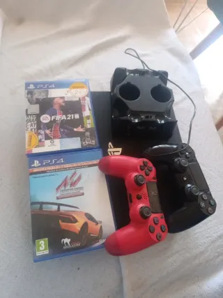 Consola PlayStation 4 en color negro, junto con dos mandos (uno rojo está con el plástico de nuevo y otro negro) y dos videojuegos. - Videojuego FIFA 21. - Videojuego Assetto Corsa Ultimate Edition. Base de carga para mandos realidad virtual y mandos normales