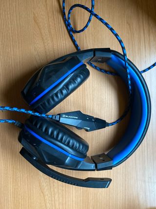 Cascos gaming negros con detalles en azul, ideales para jugar en consola. - Diseño ergonómico. - Micrófono ajustable. - Cable trenzado duradero.