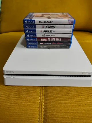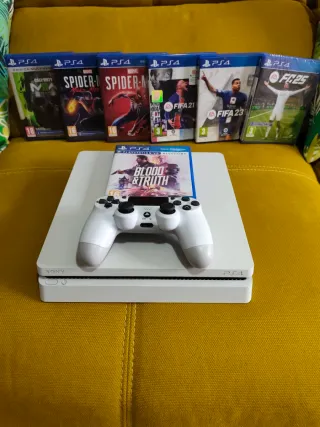 PS4 4 Slim 1TB está nueva - Incluye mando Blanco DualShock 4 🎮 - Cable de alimentación incluido🔌 - Cable carga Mando🔌 - 7 Juegos incluidos ....fisicos - Call of Duty Warfare II - Spider-Man - Spiderman Miles Morales) - FIFA 21 - FIFA 23 - FC25 - Blood & Truth - precio noooo negociable - Se hacen envíos ✈️ - Todo funciona correctamente sin errores