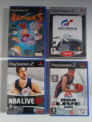 Pack de cuatro videojuegos para PlayStation 2. - Rayman 3: Hoodlum Havoc - Gran Turismo 4 - NBA Live 07 - NBA Live 2004 Todos ellos en buen estado. Con su caja original e instrucciones (excepto Rayman 3). Los discos están igualmente en buen estado. Pueden venderse por separado.