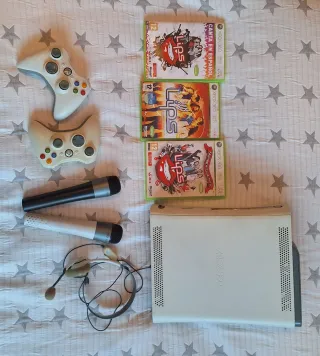 Consola Xbox 360 en color blanco, lista para horas de diversión. Incluye: - Consola Xbox 360 - Dos mandos inalámbricos - Dos micrófonos para juegos de canto - 3 Juegos "Lips" de cantar. - cables originales. Los mandos están un poco desgastados (un joystick en concreto) pero funcionan perfectamente.