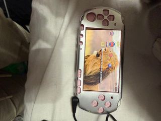Consola portátil Sony PSP 3000 en acabado plateado con detalles en rosa. - Diseño ergonómico para un agarre cómodo. - Pantalla de alta calidad. - Botones frontales y laterales. - Conexión para auriculares y cargador.