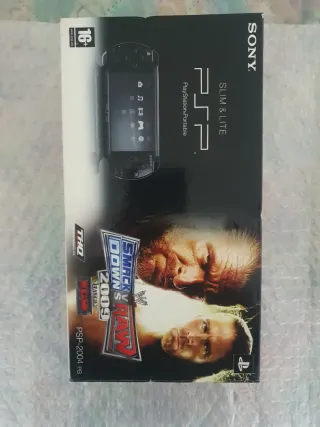 Consola portátil Sony PSP Slim & Lite en color negro. Incluye cargador y panfletos. La consola no tiene batería. - Modelo PSP-2004 PB. - Juego WWE SmackDown vs Raw 2009. - Clasificación PEGI 16+.