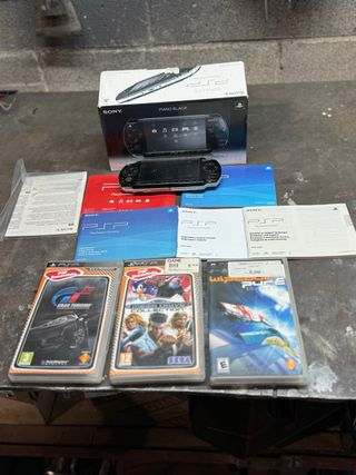Consola portátil PSP Piano Black, modelo Slim & Lite, en su caja original. - Incluye la consola. - Caja original. - Manuales e instrucciones. Psp 2004 en caja con instrucciones y 3 juegos más cables. Funciona perfecta, únicamente hay que cambiarle la batería. Incluye gran turismo mega drive collection y wipeout completos con manuales. Y cables