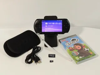 Sony PSP Street e1004 usada, en buenas condiciones de funcionamiento. Actualizada a la última versión de software 6.61 ARK-4. Carga juegos desde UMD y desde tarjeta. Incluye: - consola, - batería, - Tarjeta micro SD de 64GB (con juegos). - Funda, - correa, - cable de carga y de datos, - juego en UMD (Eyepet) - Adaptador microSD a Memmory Stick Lista para jugar. Cualquier duda, puedes preguntar.