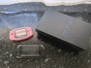 Lote de consolas de videojuegos para piezas o reparación. Incluye una carcasa Nintendo Game Boy Advance rosa y una consola Sony PSP negra. También se incluye una consola Sony PlayStation 2 negra. - Nintendo Game Boy Advance rosa - Sony PSP negra - Sony PlayStation 2 negra