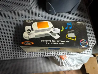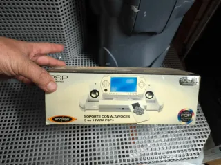 Soporte de sobremesa Ardistel para PSP con altavoces integrados. Permite cargar y reproducir contenido multimedia. - Soporte 3 en 1. - Compatible con PSP. - Incluye altavoces.
