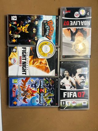 Conjunto de cinco videojuegos para PSP con estuche y manuales y otro solo el disco. - FIFA 07 - NBA LIVE 07 - Fight Night Round 3 - Ratchet & Clank: El tamaño importa - Invizimals: La caza comienza aquí - Ape academy nota: el FIFA tiene una pequeña grieta que no afecta al funcionamiento.