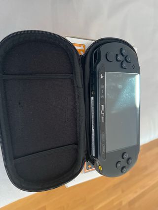 Consola portátil en color negro, modelo PSP 2004 slim. Ideal para amantes de videojuegos clásicos como los de la Neo Geo. Trae cargador y tarjeta memory stick con decenas de títulos. - El pack incluye 4 juegos y funda para transportar: - Mind Quiz - F1 06 Formula 1 - PES 2010 Pro Evolution Soccer - Daxter La bateria no funciona, pero se puede jugar perfectamente enchufada con el cable de corriente.