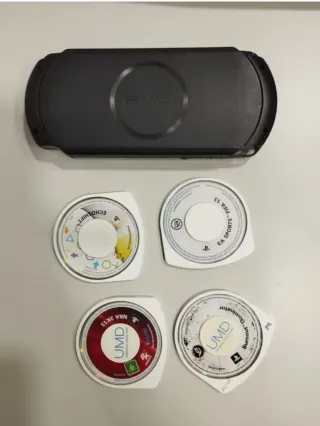Videoconsola PSP con cuatro juegos y tarjeta memoria 4GB. ⚠️Consola para piezas ya no tengo cables y no puedo asegurar su funcionamiento. - Juegos incluidos: ECHOSHIFT, FIFA 13, NBA 2K13, Burnout Dominator. - Incluye tarjeta de memoria Memory Stick PRO Duo de 4GB. 👉Puedes ver otras opciones en mi perfil: - 4 juegos 35€ - 1 Consola 35€ - 2 consolas + 4 juegos + tarjeta memoria 4G > 90€