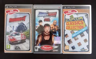 Lote de tres videojuegos para PSP. Completos. En muy buen estado. - Burnout Legends - WWE SmackDown vs. Raw 2008 - Capcom Classics Collection Reloaded