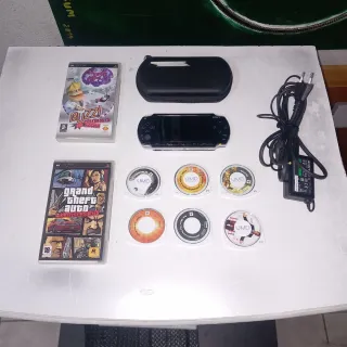Consola Sony PSP. Funciona perfectament i estat estètic molt bo. No té bateria, però adjunto carregador. Regal de set jocs, una pel·lícula i funda de transport.