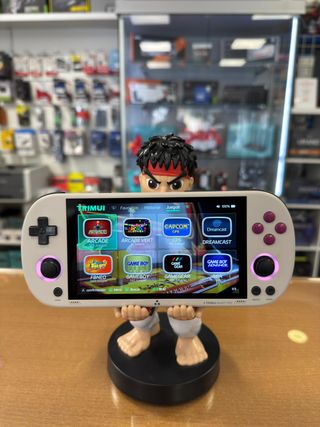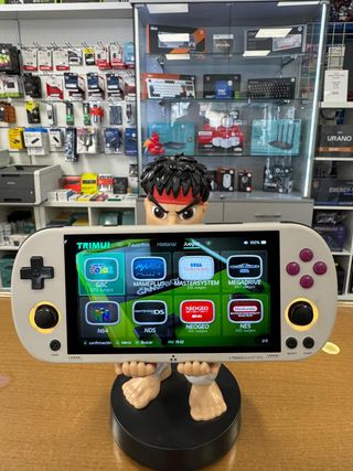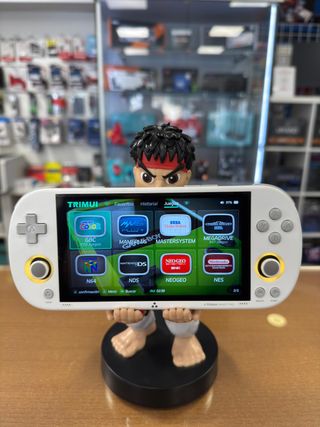 Consola portátil TRIMUI SMART PRO con acabado gris y blanco. Incluye tarjeta de memoria de 64GB. Emula hasta PSP - Pantalla de alta resolución. - Controles ergonómicos. - Diseño compacto y ligero.