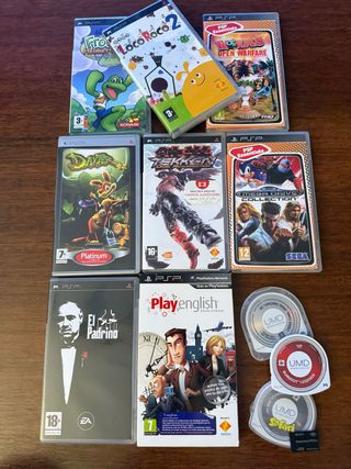 Pack de juegos para PSP que incluye una Memory Stick PRO Duo de 4GB. - Frogger: Helmet Chaos - Loco Roco 2 - Daxter - Tekken Dark Resurrection - Mega Drive Collection - Worms Open Warfare - El Padrino - Play English - Burnout Legends - Formula One 06 - Crisis Core - Final Fantasy VII Juegos a partir de 3 euros. Pack completo 80 euros Pregunta por tu juego y le ponemos un precio.