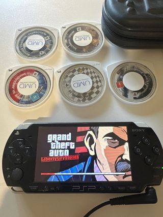 Consola portátil Sony PSP en color negro, junto con cinco juegos en formato UMD. necesita una bateria nueva nada mas respecto a funcionamiento lo unico a destacar que el r1 necesita un poco mas de fuerza. pero funciona. - Juegos incluidos: F1 Grand Prix,, Football, assasins creed Bloodlines , wwe 2007, medievil resurrection y gta liberty city. - Incluye funda protectora. - incluye cargador