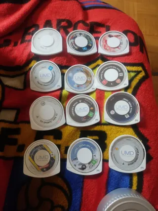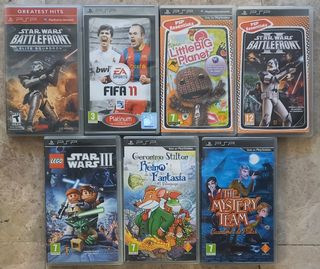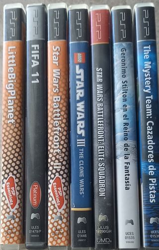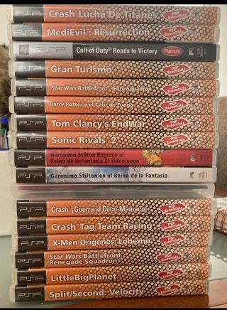 17 juegos PSP en venta. Están en buenas condiciones y se incluyen los manuales de al menos dos de ellos. Los títulos incluidos son: MediEvil:Resurrection, Harry Potter y el Cáliz de Fuego, Tom Clancy's EndWar, Sonic Rivals 2, Geronimo Stilton Regreso al Reino de la Fantasía, Geronimo Stilton en el Reino de la Fantasía, Crash Guerra al Coco-Maníaco!, Crash Tag Team Racing, X-Men Orígenes: Lobezno, Star Wars Battlefront: Renegade Squadron, LittleBigPlanet, Split/Second: Velocity, Crash Lucha de Titanes, Call of Duty Roads to Victory, Gran Turismo, Star Wars Battlefront: Elite Squadron. Todos con manual menos 2.