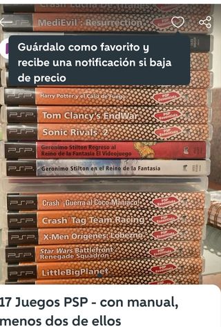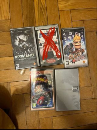 Vendo colección de juegos para PlayStation Portable (PSP). Se venden en pack o individuales. ⬇️ Precios individuales e info de cada uno ⬇️ Resistance Retribution: UMD en muy buen estado. Portada no original. 7€ Buzz! El concurso de los bombazos: UMD en perfecto estado, caja original y papeles originales. Poco uso. 7€ Crash Tag Team Racing: Crash tag team racing. UMD en buen estado. Caja original, papeles originales en perfecto estado. 7€ Medievil : UMD en muy bien estado. No portada pero si caja. 8€ Los precios pueden llegar a ser algo negociables JUEGOS REVISADOS, FUNCIONAN CORRECTAMENTE. Hago envíos y entrego en mano