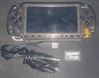 Consola portátil PSP Fat con carcasa personalizada. - Carcasa transparente con detalles en negro y blanco. - Incluye cable USB y adaptador para tarjeta micro SD. -CFW targeta sd 64 gb -Tiene lector de discos pero no le va mu bien.