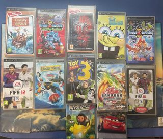Se vende lote de consola PSP, cargador, funda y varios juegos. - Consola PSP - Cargador - Funda protectora - Juegos incluidos: FIFA 12, FIFA 10, Invizimals, Toy Story 3, Bakugan Defenders Core, Locos por el surf, Colegas en el bosque, Eyepet Exploradores, Spiderman 3, Bob Esponja El Conquistador y los de la siguiente foto. Precio fijo, acepto negociaciones