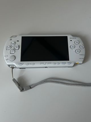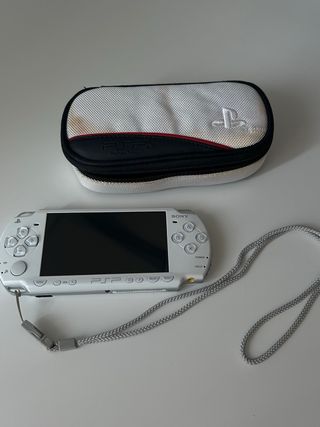 Consola portátil Sony PSP en color blanco, incluye funda protectora. - Diseño compacto y ligero. - Pantalla de alta calidad. - Funda con cierre de cremallera.