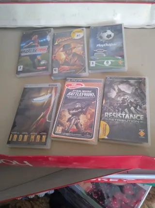 Se vende lote de 6 juegos para PSP. Escucho ofertas - PES 2009 - Indiana Jones y el Emperador de Jade - PlayChapas - Iron Man - Star Wars Battlefront: Elite Squadron - Resistance Retribution