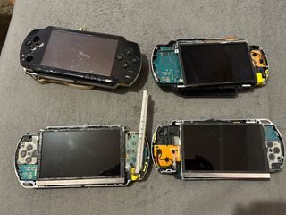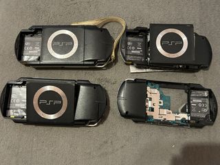 Lote de cuatro consolas PSP 1004 para piezas o reparación. Ideales para técnicos o aficionados que necesiten componentes. - Consolas para desmontar o reparar. - Incluye baterías y tapas de batería.