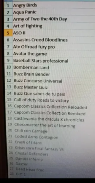 Lote de juegos para PSP, ideal para revivir tus aventuras. Listado disponibles fotos anuncio para saber mas chat. Solo entrega en mano en Zaragoza. Precio a convenir. - Angry Birds - Aqua Panic - Army of Two the 40th Day - Art of fighting - ASO II - Assassins Creed Bloodlines - Atv Offroad fury pro - Avatar the game - Baseball Stars professional - Bomberman Land - Buzz Brain Bender - Buzz Concurso Universal - Buzz Master Quiz - Buzz Que sabes de tu pais - Call of duty Roads to victory - Capcom Classics Collection Reloaded - Capcom Classics Collection Remixed - Castlevania the dracula X chronicles - Chessmaster the
